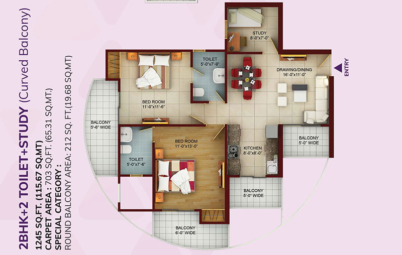 | 2BHK + 2 Toilet + Study (Curved Balcony) | 1245 Sq. Ft. | On Request | Whatsapp Chat |