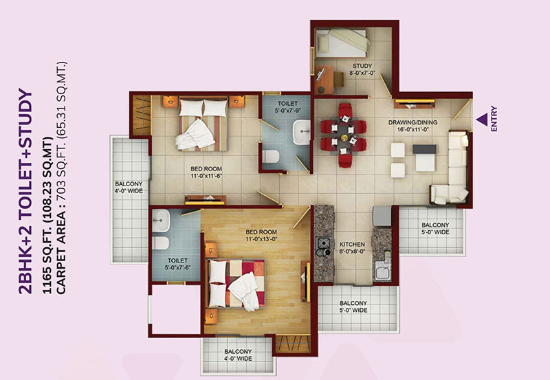 | 2BHK + 2 Toilet + Study | 1165 Sq. Ft. | On Request | Whatsapp Chat |